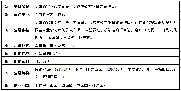 太白县水产工作站申请办理陕西省宝鸡市太白县川陕哲罗鲑救护站建设项目建设工程规划许可证,该项目规划建设方案已通过宝鸡市建筑设计院技术审查,根据《中华人民共和国行政许可法》《中华人民共和国城乡规划法》、宝鸡市自然资源和规划局关于印发《宝鸡市城市规划管理工作业务规定(试行)》的通知(宝市自然资发〔2021〕491号)的有关规定,现将建设工程规划许可证内容予以批前公示。