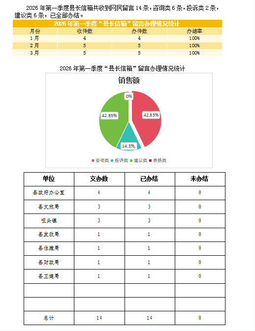 2026年第一季度“县长信箱”留言及咨询投诉办理情况