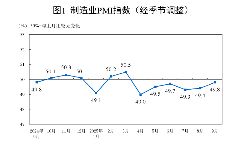 国家统计局9月30日发布数据显示,9月份,制造业采购经理指数(PMI)为49.8%,比上月上升0.4个百分点;非制造业商务活动指数为50.0%,比上月下降0.3个百分点;综合PMI产出指数为50.6%,比上月上升0.1个百分点。