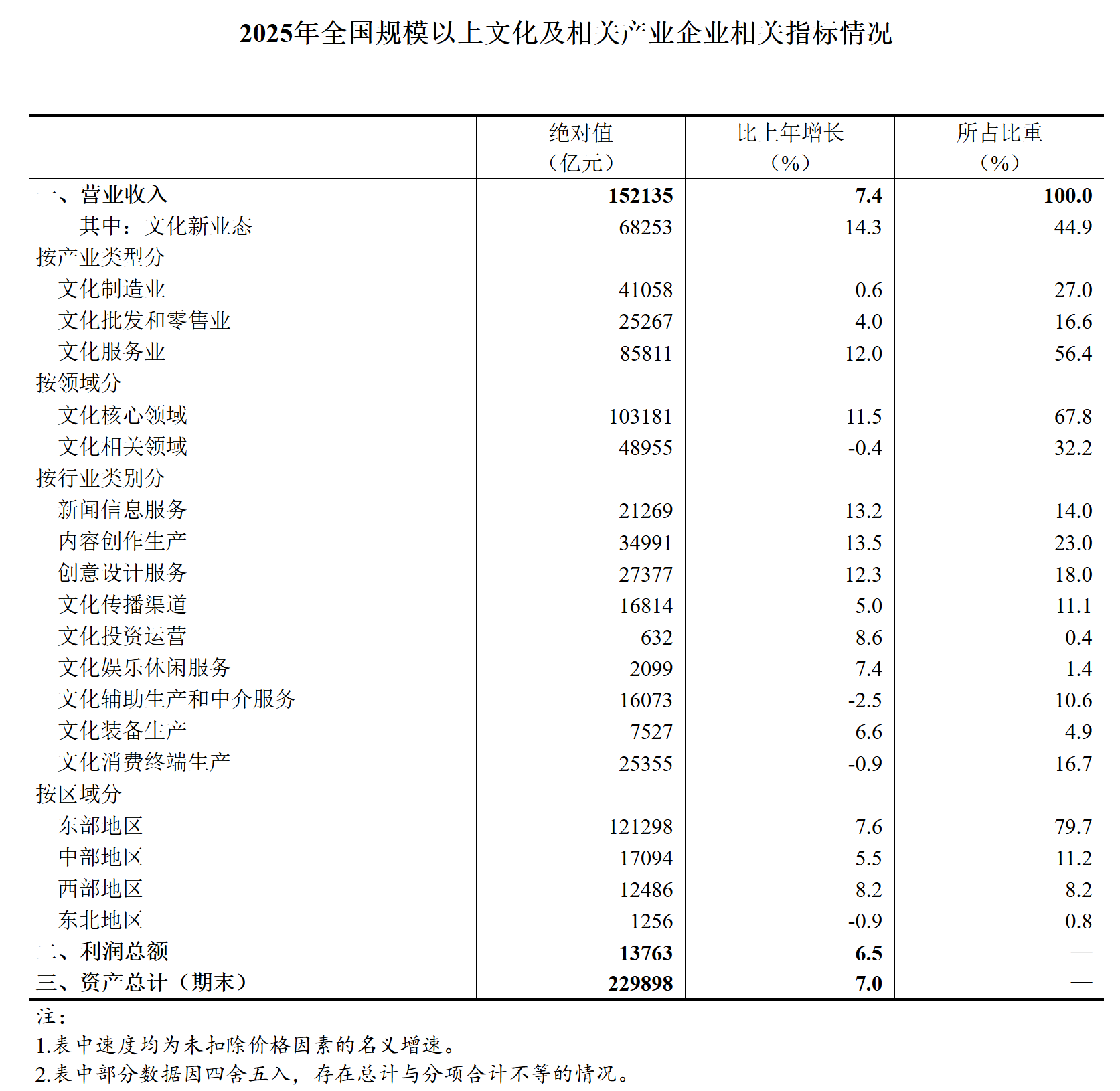2025年,文化企业实现利润总额13763亿元,比上年增长6.5%;营业收入利润率为9.05%,与上年基本持平。2025年末,文化企业资产总计229898亿元,比上年增长7.0%;每百元资产实现营业收入为68.6元,同比增加0.3元。